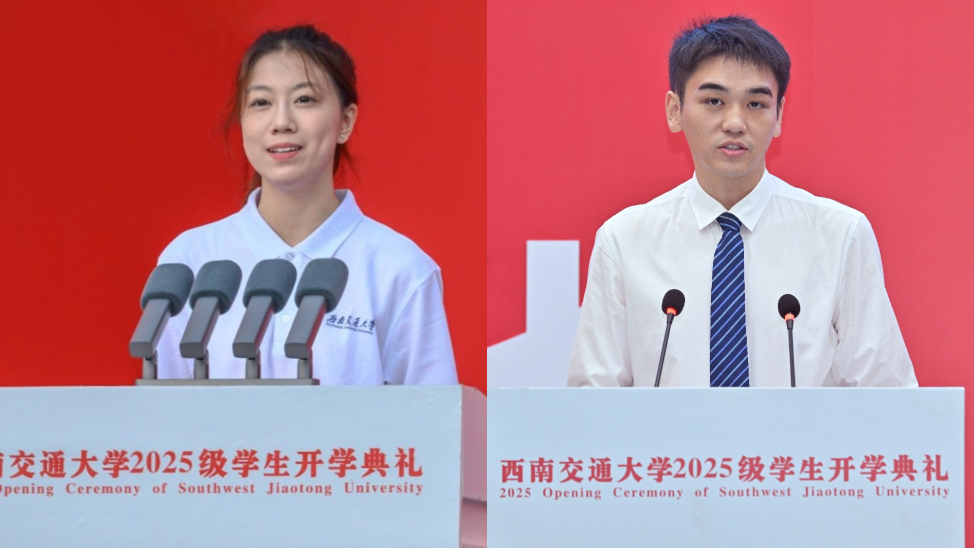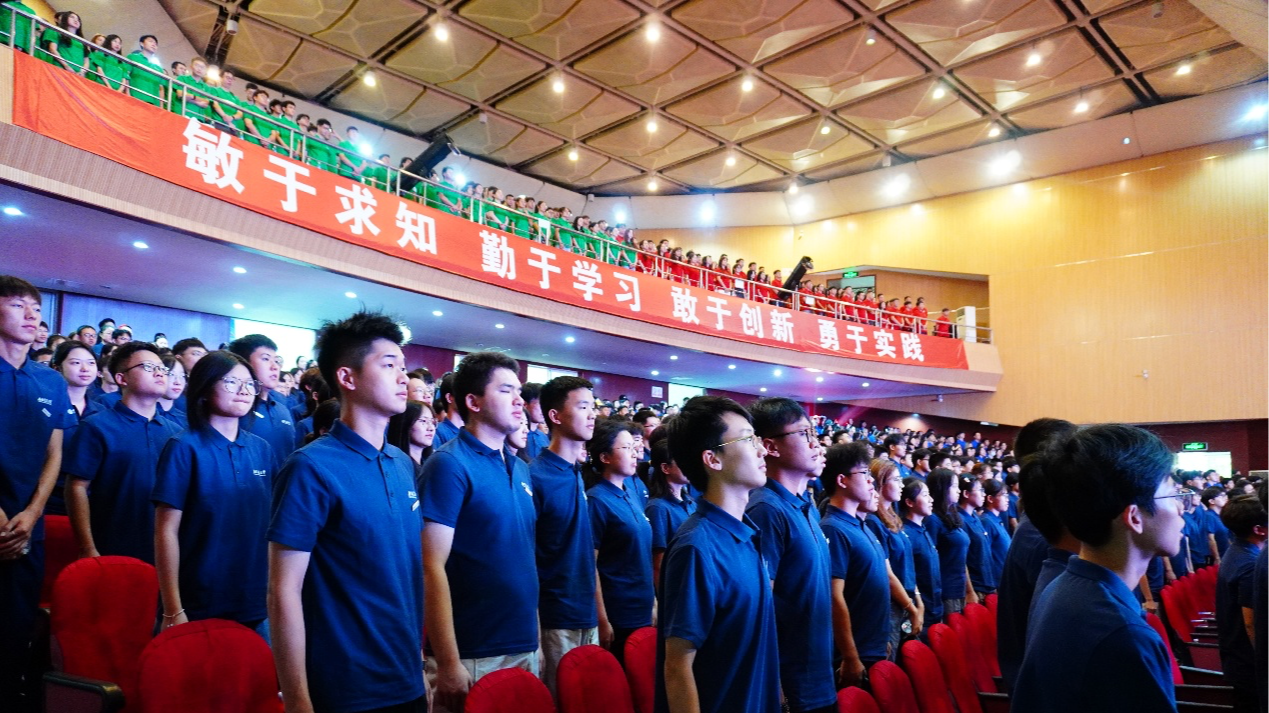 主席台前排就座的领导、老师为新生代表佩戴西南交通大学校徽,全场新生起立自行佩戴校徽,并庄严宣誓。从此刻起,他们将以交大人的身份,以青春之名担当时代使命,奔赴新的征程。