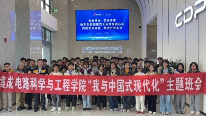 助推产教融合,强化“生涯领航力”。紧扣行业需求与个人发展,通过校企合作与产教融合,搭建理论与实践衔接的桥梁。邀请中车科学家刘国友开展“轨道交通中的功率半导体”专题讲座,勉励学子坚定信念、勇于创新,成长为集成电路领域的卓越人才。组织“我与中国式现代化”主题班会,带领研究生走进成都高投芯未半导体有限公司,实地了解行业前沿动态与人才需求,培养学生的行业思维与前瞻视野,为职业发展蓄力赋能。“走出去”与“请进来”相结合,邀请中车株洲机车研究所、飞腾信息技术有限公司技术负责人进校宣传交流,深化校企合作,引导学生深刻感悟攻克芯片“卡脖子”技术瓶颈,强化学生在服务国家科技自立自强战略中的探索实践与使命担当。